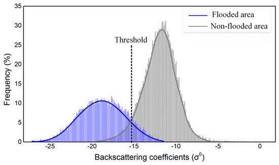 Finally, the established PDFs were used to determine the threshold of intensity for initial flood mapping. This scheme restricts the thresholding to pixels situated in flood-prone regions by eliminating other disturbances. The statistical distributions of the backscattering coefficients are fully considered, proving to be more reliable for identifying flooding than the thresholding segmentation used in previous studies [14,42]. The selected threshold is generally high, as this guarantees the successful mapping of areas with a relatively small extent of surface water or with dispersed water bodies. In this study, a relatively conservative global threshold value of −15 dB was derived and applied to the scenes. Histograms of the backscattering coefficient of 2015 flood and non-flood sample objects, and the corresponding PDF curves, are shown in Figure 4. The range of the flooded images relies on the statistical relationships of the pixel backscattering values of the entire image. The number of pixels below −15 dB represents the large population of flooded pixels.