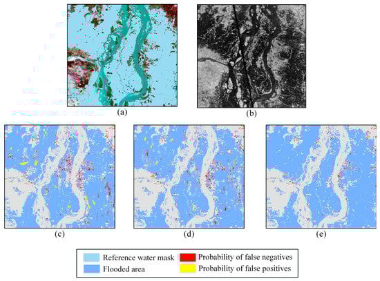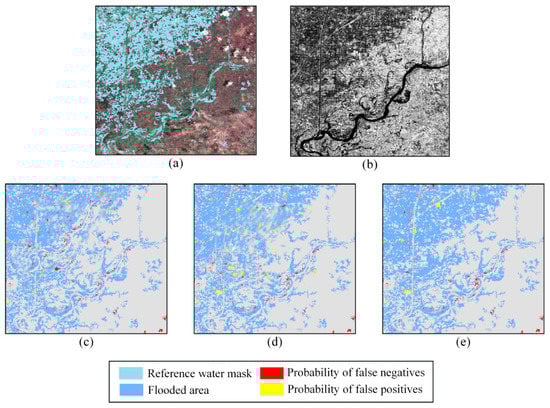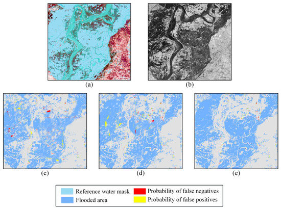 Results for validation site B. (a) GF-2 PMS scene acquired 20 July, 2015, band combination 3-2-1 (natural color). Overlay: reference water mask. (b) Sentinel-1 scene acquired 18 July, 2015, in VV polarization. The final flood areas are extracted from the SAR image using the method developed by (c) Ohki et al., 2020, (d) Shahabi et al., 2020, and (e) our study. See Figure 1 for the location of the validation site.
