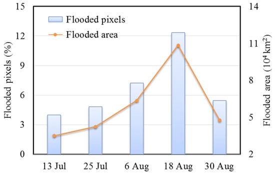 A time series of Sentinel-1 images for the 2015 flood season was evaluated to determine the extent of flooding in Pakistan. Figure 8 shows the extent of inundation over time as extracted by the proposed method, as denoted by blue overlaid on the administrative boundaries of Pakistan. Figure 9 illustrates the percentage of flooded pixels and the total area during the flood season in 2015. The entire flood extent increased from 13 July to 18 August, flooding along the drainage network is clearly more extensive than at the previous stage. Flooding in 13 July displays the least amount of flooding (about 3.97% of the total area of the country), had the smallest extent of 35,000 km2, as this is the initiation of flooding in the year of 2015. Due to the influence of the monsoon season, the time to maximum flood extent is rapid in Pakistan. The largest extent of flooding appeared in 18 August (covering ~108,500 km2), occupied an area of about 12.33% of the whole country. These maps dynamically capture the temporal and spatial distribution of the floods. All the maps show flooding mainly occurred in Punjab and Sindh provinces, along the major rivers of the Indus, Chenab, Sutlej, and their deltas. The flood was most densely distributed at the upper reaches of the Indus River confluence. Khyber Pakhtunkhwa province, in the northwest of Pakistan, was also hit by varying degrees of devastation. Besides, flood water spread rapidly near the eastern edge of Punjab province. After mid-August, there is a large reduction in the flooded area, which is quite similar to the flood extent on 25 July, possibly indicating that the flood in 30 August was starting to recede. Based on the above analyses, we can see that widespread and rapid flooding occurred in Pakistan from July 2015, especially in eastern regions, and the flooding disaster was most devastating in mid-August.