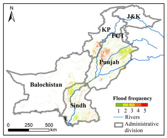 Figure 10 illustrates the spatial frequency of the flooding. This also indicates the potential extent of flooding and the level of flood risk. From Figure 10, it can be found that red and orange areas flooded more frequently in July–August 2015; these areas are located between the Indus and Chenab rivers, and this result may reflect the certainty of flooding in future flood seasons. The multiple occurrences of flood events in these key areas suggest the presence of high risk and an increased degree of destruction. For these five periods, 7% of flooded pixels have been inundated at least twice and 3% have been flooded at least three times.