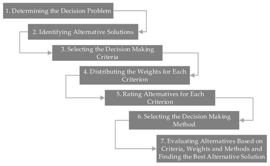 Decision making is the process of selecting a specific alternative from a set of solutions in a systematic and logical way, based on the values and references of the participants in the decision-making [45]. Alternatively, decision-making can be defined as the process of adequately reducing uncertainty and doubt about alternatives in order to allow a reasonable choice between them [46]. The methodology involved in this specific decision-making process includes the following steps, as shown in Figure 1, and is influenced by the work of Fülöp [45]: