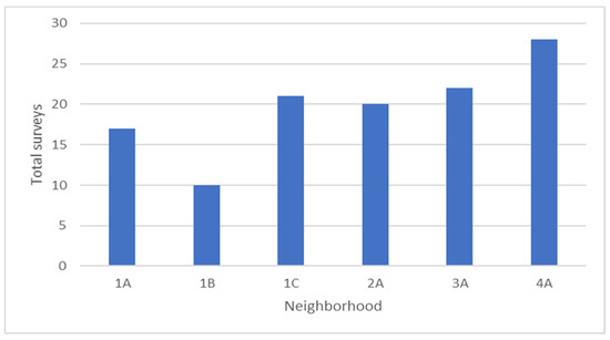 The analysis of the situations within the six neighborhoods is treated in an aggregated manner. Nevertheless, the outcome is proof of the diversity of the sample. It is interesting to begin by describing the number of surveys collected in each neighborhood out of the total of 118. Figure 2 introduces this information.