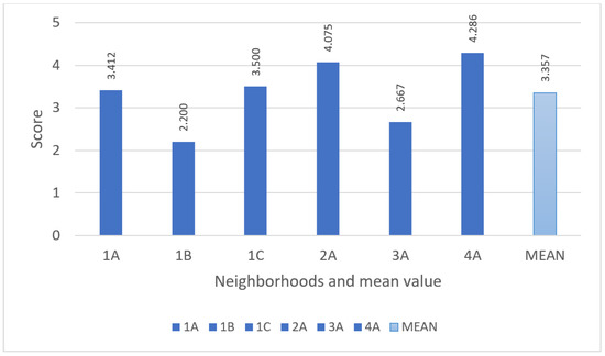 Although the object of this study is to address an aggregated analysis, a last descriptive result can be provided. The disaggregation of the results by neighborhood can provide sensitive information for readers about the reality of each context. Therefore, Figure 7 highlights the scores received by each dimension in each of the six neighborhoods analyzed, while also introducing the presentation of the results in a radial diagram, which is the preferred presentation.
