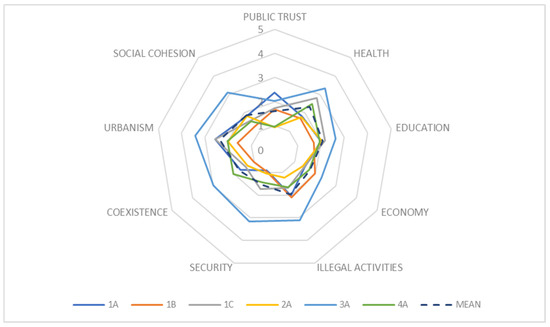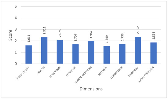 The nine remaining dimensions can be grouped into two types; seven of them refer to different aspects of social exclusion and deprivation, namely health, education, employment and income, presence of illegal activities, security, coexistence, and urban exclusion, while the other two are considered essential conditions or prerequisites to facilitate development and inclusiveness processes in the neighborhoods—public trust and social cohesion. Figure 6 presents the average scores by dimension.