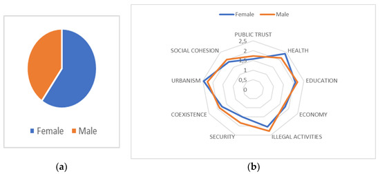 First, we introduce a gender-based analysis. Males and females are generally deemed to have different perceptions about social problems and their intensity [56,57,58]. However, in our database, no significant differences are observed between men and women with regard to their judgment on the challenges they face. As shown in Figure 8, there is a slightly more negative opinion by women about the situation of coexistence, security, and the presence of illegal activities in the neighborhood, which could be linked to the greater amount of time they spend in it. The literature has also proven how females usually demonstrate a better confidence in the healthcare system [59] and empathy with healthcare workers [60], which is again consistent with our results.