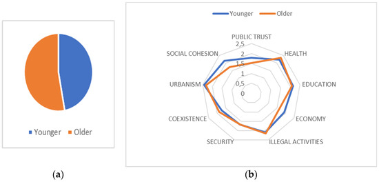 Actually, age is another intersectionality that the literature has identified as explaining differing perceptions about the social reality [61,62,63,64]. Age is also widely deemed to be a predictor of social participation and volunteering [65]. Consistent with that evidence, in our database, older people are more critical when evaluating commitment with the transformation of the neighborhood, both from their own neighbors and from public administrations (see Figure 9). It is important to highlight this difference, since most associative movements in marginalized urban areas are composed of older people [66]. Their vision may suppose a certain confrontation with the public administration or even a disincentive for younger people to join the partnership.
