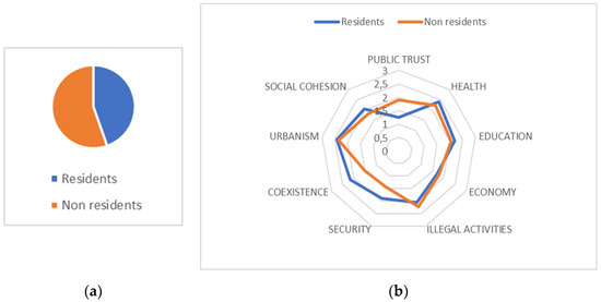 A third analysis can be offered to distinguish those who are residents of the neighborhood from those who work in it. Differences in perceptions between residents and nonresidents have been deeply proven by the literature, mainly in fields such as tourism [67,68] and in perceptions about neighborhoods [69]. It is interesting to note, in our database, how the people who spend their daily lives in the neighborhoods have a much better perception of their contexts than do the people who work but do not live in them (see Figure 10). This difference is highly significant in the dimensions of coexistence and security, which are considered more negatively by nonresidents, and it is also observed in the distrust of the public administrations that residents feel. In a similar vein, even though the difference is not significant, social cohesion and commitment to the social transformation of their neighborhoods seem to be overestimated by residents. As collaborative partnerships are composed of residents and nonresidents, it is interesting to track how these divergencies could affect the sustainability of the partnerships.