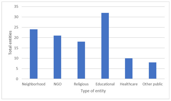 In our case study, partnerships are wide open and diverse since they are composed of public, public–private, private actors, and civil society organizations. Out of the 118 partners working in the six neighborhoods, 63 are identified as private and 50 as public entities. To introduce a general overview of the nature of the organizations, we introduce a classification in Figure 11. Neighborhood entities comprise neighbors’ associations and grassroots civil society organizations. Nongovernmental organizations (NGOs) are civil society organizations that work, but not exclusively, in neighborhoods. We classify entities as religious when they have such a nature and are based in a church. Educational entities comprise educational bodies, including both primary and secondary schools and universities. Healthcare entities include health centers and private actors such as pharmacies. Finally, we classify community or civic centers or delegations of the municipality as other public entities.