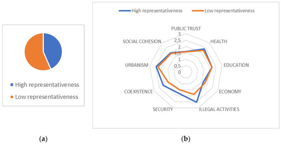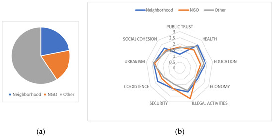 It is interesting to first take a look at diversity. The literature identifies the level of diversity in a given context as a controversial factor that either enhances or hinders the consolidation of partnerships [32,33]. As a consequence, in this study, we use this dimension only to highlight the different nature of each neighborhood. Nevertheless, in general, diversity is prominent, mainly given to the presence of the Roma people, but also, in some contexts, due to the location of migrants, who are mostly from North Africa and Latin America. Figure 5 shows the diversity picture of the sample of neighborhoods.