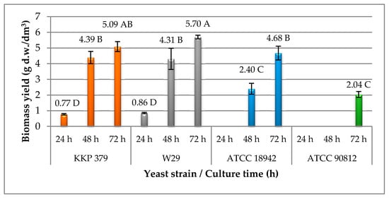 The highest dry biomass yield values were obtained in cultures of KKP 379 and W29 strains. These values after 72 h of culture were 5.09 ± 0.32 and 5.70 ± 0.12 g·d.w./dm3, respectively. For the remaining strains, their growth was definitely weaker and a biomass yield of 4.68 ± 0.44 g d.w./dm3 after 72 h was obtained for the ATCC 18942 strain. The weakest growth was observed in the ATCC 90812 strain culture, and its biomass yield after 72 h was more than two-fold lower in comparison with other tested strains and it was 2.04 ± 0.19 g d.w./dm3.