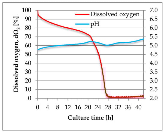 Y. lipolytica W29 was selected for the next stage of the research, i.e., cultivation in a laboratory bioreactor. During the 2-day batch culture in the laboratory bioreactor, the pH value did not change much and varied between 4.5 and 5.5 (Figure 3).