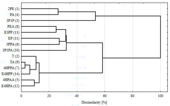The results of cluster analysis. Abbreviations: 2PE—2-Phenylethanol; PEA—Phenethyl acetate; T—Tyrosol, TA—Tyrosyl acetate; 3P1P—3-Phenyl-1-propanol; 3P1PA—3-Phenyl-1-propyl acetate; PA—Phenylacetic acid; EP—Ethyl phenylacetate; 4HPAA—4-Hydroxyphenylacetic acid; E4HPA—Ethyl 4-hydroxyphenylacetate; 3PPA—3-Phenylpropanoic acid; E3PP—Ethyl 3-phenylpropanoate; 4HPPA—3-(4-hydroxyphenyl)propanoic acid; E4HPP—Ethyl 3-(4-hydroxyphenyl)propanoate.