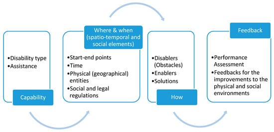 - Gharebaghi, A.; Mostafavi, M.-A.; Chavoshi, S.H.; Edwards, G.; Fougeyrollas, P. The role of social factors in the accessibility of urban areas for people with motor disabilities. ISPRS Int. J. Geo-Inf. 2018, 7, 131. [Google Scholar] [CrossRef]