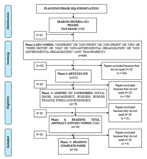 In contrast, the traditional SLR based on the manual selection of articles allows—through Boole algebra commands—the building of data sets to study relationships between theoretical concepts. This fact of manually defining the search commands makes it more suitable for a literature review in our field of research. Considering all the above, we finally adopted a manual technique for our SLR. This allowed us to use different terms to define organizations that make up the third sector and relate them to the concept of transparency. In detail, we used the following commands: “NONPROFIT”, “NON PROFIT”, “NON-PROFIT”, “NPO”, “THIRD SECTOR”, “THIRD-SECTOR”, “NGO”, “NON-GOVERNMENTAL ORGANIZATION”, “NON GOVERNMENTAL ORGANIZATION”, “TSO”, and “NONGOVERNMENTAL ORGANIZATION”. The SLR was structured in different phases, which are described below.