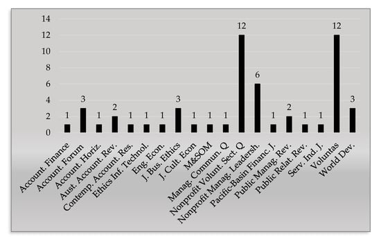 The 54 studies which constituted the final sample were published in 19 journals. Figure 2 presents the number of papers in each journal during the period 2005–2019. As can be observed, almost 55.56% of the papers selected were published in three specific non-profit journals: Nonprofit and Voluntary Sector Quarterly, Nonprofit Management & Leadership, and VOLUNTAS: International Journal of Voluntary and Nonprofit Organizations. The rest of the papers (44.44%) were published in other Social Sciences journals that were not specifically focused only on third sector research topics.