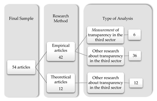 NPOs should develop an accountability regime that reaffirms their important contribution to society, proposing an approach based on legitimacy [28]. Therefore, mechanisms that enable stakeholders to assess the appropriate destinations of resources according to their purpose and social mission are needed [13]. In this study, we analyzed the extant of research on the transparency of NPOs. The objective of our systematic literature review (SLR) is, first of all, to deepen the knowledge of NPO management and the understanding of the value that the concept of transparency has as an essential issue in accountability. Next, we analyze the state-of-the-art of the literature about transparency in NPOs, especially observing which of the published articles in our sample have adopted any kind of empirical procedure. Lastly, as a conclusion of this study, we also debate whether it is possible to establish a criterion for the measurement of transparency as a key aspect for the future of NPOs. This work aims to deepen the knowledge of transparency in the third sector. Despite the importance that the concept of transparency has for generating credibility with society, it is not a phenomenon that is widely studied. For this reason, we intend to expand the understanding of transparency measurement in NPOs. To do this, we carefully analyze the few articles in the prior literature that have specifically addressed this issue as their focus of research. Our study, thus, aims to contribute to addressing an important research topic that requires wider development in the literature.