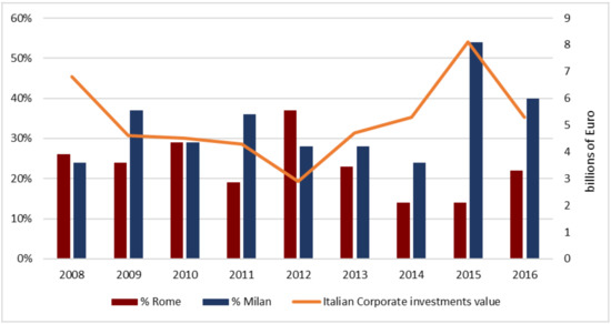 The choice of these two Italian cities is linked to the highest interest for corporate properties at the national level. Figure 1 shows the percentage of corporate investments from 2008 to 2016 with reference to the cities of Milan and Rome and compared to the Italian context [121]. The graph attests the most relevance for the two Italian cities in terms of a high amount of corporate investments.