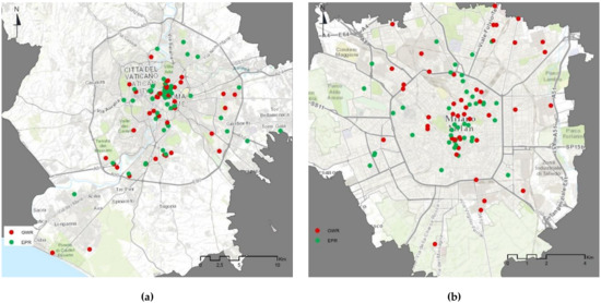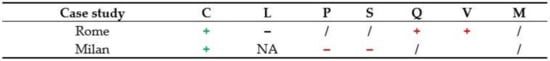 and are spatially heterogeneous, both for Rome and Milan. This behaviour outlines the absence of a specific spatial distribution of these variables, taking into account the relationships observed through the values associated with the properties in the database. The variable is the only one for which the two cities present a very different Moran I, which is probably more connected to the specific location of the properties than to reasons related to the construction of the variables, or to the geography of the public green areas.