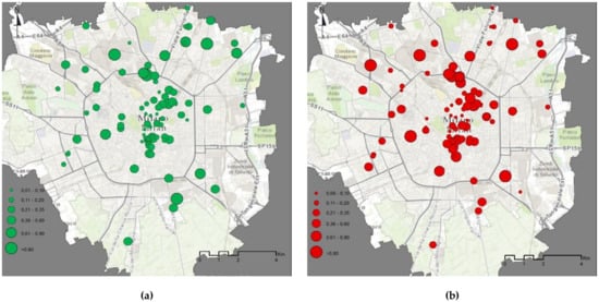 These results can be interpreted taking into account the construction of the database itself; in fact, for both the cities, the most autocorrelated variable is , which reflects a logic of the continuity of the variation of the population in the space, independent from the temporal component. For the variables and there is also a high spatial autocorrelation both in Rome and in Milan: the OMI of the Italian Revenue Agency has detected that there is a difference between the selling prices in the central areas and those in the peripheral areas equal approximately to 50% in the city of Rome, and to 70% in the city of Milan. This observation is consistent with the spatial distribution, and the consequent autocorrelation, of the variable —especially for the city of Milan—and of the variable —especially for the city of Rome, where the properties with the highest architectural quality are located in the central areas.