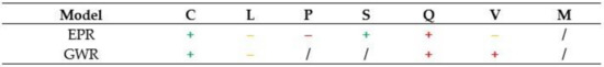Starting from the concept underlying the regression models for the mathematical description of the GWR model, i.e., the determination of the relationship among two or more sets of variables, the most common situations involve the presence of a response variable and a number of input variables , ,…, . If the regression is linear, the Equation (3) shows the respective functional form: