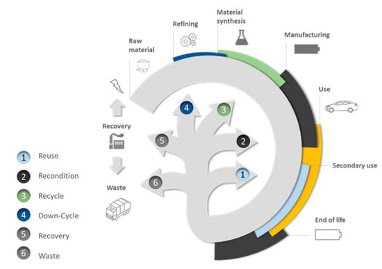 As shown in Figure 1, there are various options for extending the useful life of battery materials. One approach is to reuse or recondition used battery packs for use in “second life” applications. At the end of their first (EV) life, many batteries will still retain over 75–80% of their original capacity and could, therefore, be used in less demanding applications [6]. This generally involves collecting used EV LIB systems and re-conditioning them for lower-power applications, such as energy storage and back-up power. The lifetime of the original battery is thus extended, contributing to lower lifecycle emissions and a reduced demand for critical materials. This approach has been used in many projects.
