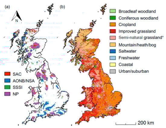We obtained the global 1 km resolution raster layer of tree restoration potential from [] and cropped the data to the study area extent. Each pixel value in the raster layer corresponds to the potential additional tree canopy cover (% aerial cover) that could be supported in that grid cell. To represent habitats and land use, we used the 1 km resolution percentage target class version of the Land Cover Map 2015 (LCM2015) for Great Britain []. The raster data contain 21 bands, with each band corresponding to a land cover class. Pixel values in each band quantify the percentage cover of the corresponding land cover class in that grid cell. We split the bands into two sets (Table 1). Set 1 incorporated land cover classes considered suitable for tree restoration under the approach of Bastin et al. [], including grassland, heathland, and sediments. Land cover classes for supra-littoral and littoral sediment were combined. Set 2 included only urban/suburban areas and cropland, which Bastin et al. excluded from their predictions, but which nevertheless could be considered for tree restoration. Other land cover classes (woodland, bare rock, and aquatic habitats) were not considered in the analyses. We downloaded further spatial data on the location of protected sites in Great Britain (Table 1), including Special Areas of Conservation (SACs; designated under the EU Habitats Directive), Sites of Special Scientific Interest (SSSI; a conservation designation to protect rare biological, physiological, or geological features), Areas of Outstanding Natural Beauty (AONBs) or National Scenic Areas (NSAs) in Scotland (protected for their scenic value), and National Parks (NPs; a designation that recognises both the natural and cultural values of the landscape). Thus, we had information on the cover of habitats, land use, and protected areas in every 1 km grid cell across the study area (Figure 2).