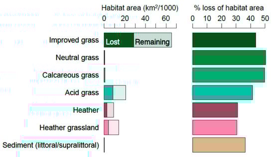 Our spatial analysis indicated that, under the full tree restoration potential of Bastin et al. [], 30–50% of habitats would be lost (Figure 3). In absolute terms, the losses are greatest for improved grassland at 28,491 km2, a large proportion of the total 42,289 km2 of land identified by [] as suitable for tree restoration in GB. In relative terms, neutral and calcareous grassland suffer the greatest losses with each habitat reducing in area by 50%. To put these figures into context, if tree cover in urban areas was increased by 5–20% this would represent an additional 836–3343 km2 of land under tree canopy. For cropland, an increase of 5–20% canopy cover would represent some 2746–10,983 km2 in absolute terms.