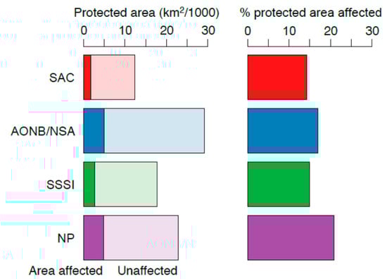 Under full tree restoration potential, 14–21% of protected areas would be covered with additional tree canopy (Figure 4). This equates to a total area of 10,943 km2 when overlapping designations are accounted for, a figure equal to one quarter of the total potential area of tree restoration in GB according to []. AONBs are most affected, with an additional canopy cover of 4950 km2. A similar area of 4775 km2 is affected in NPs (21% of the total NP area).