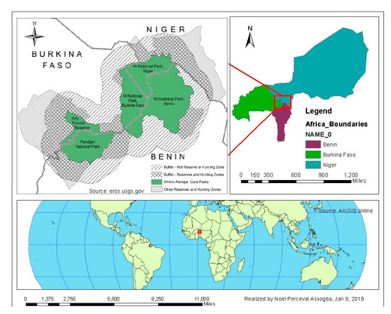 The periphery of the W Reserve comprises about 210 villages with a human population estimated at 405,000 [48]. This population belongs to different ethnic groups who share several ties and cultures. Particularly, the population in the periphery of the reserve has a long history of relationships with their natural environment with farming, hunting, cattle grazing, and wood and non-wood resources as their main source of livelihood. Although there are collaborations and concertation in the management principles of the reserve, each country managed the areas of the reserve on its territory based on its national legislation. Figure 1 presents the study area.
