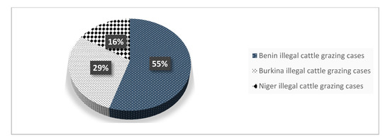 The number of infractions was unevenly distributed across the three countries. While the cases of illegal farming (35) in the reserve were only recorded in Benin, illegal cattle grazing cases (161) were observed in the three countries. Figure 2 presents the distribution of cattle grazing cases in the region. The highest number of illegal cattle grazing cases were recorded in Benin, representing 55% of the total number of cases followed by Burkina Faso with 29% of the cases. The lowest number was recorded in Niger, 16%. Note that the average distance between the villages and the reserve was estimated at 15.32 kilometers.