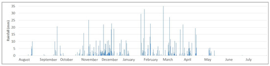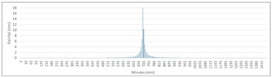 The designed rainfall was built using the IDF curve with the alternating blocks method for a 10-year return period and a 24 h duration. The total determined precipitation depth was 91.7 mm, as shown in Figure 5. Continuous one-year rainfall data were selected from the series registered by the National Meteorological Institute rain gauges in Brasilia [55] by choosing a year with total rainfall depth near the series’ annual mean value. The total rainfall of the continuous year was 1457 mm, with a 1 h time interval (Figure 5).