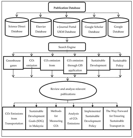 This paper presents the body of information collected from a thorough review of the literature from electronic sources, including journals, books, reports published by an international organization and articles. The articles were found in the Science Direct, Elsevier, e-Journal Portal Universiti Kebangsaan Malaysia (UKM) and Google Scholar databases and Google database through a search engine using six keywords: greenhouse gases; CO2 emissions; CO2 emissions from transportation; CO2 emissions through Geographical Information System (GIS) application; Sustainable Development Goals (SDGs); sustainable policy. All articles have been subjected to a peer review process and were published between 1996 and 2019. Then, six topics were determined based on the review: (1) CO2 emissions from transportation, including 13 papers; (2) methods for measuring CO2 Emissions, including 20 papers; (3) analysis of CO2 emissions, including 20 papers; (4) implemented sustainable development policy, focusing on 15 countries that have paid attention to sustainable development, including Australia, Bangladesh, Brunei, Cambodia, China, India, Indonesia, Japan, Korea, Malaysia, Singapore, Thailand, the United Kingdom (UK), Uruguay and the USA; (5) Sustainable Development Goals (SDG) in Malaysia; (6) the way forward for ensuring sustainable transport in Malaysia. We also carried out a comparison analysis to determine which method is suitable for use to measure CO2 emissions in the air; CO2 emissions analysis publications were also used to determine which countries and journal databases focused more on CO2 emissions from transportation in academic publications. Figure 2 shows the overall methodology for this study.