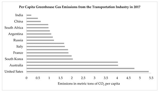 - Statista Portal. Per Capita Greenhouse Gas Emissions from the Transportation Industry Worldwide in 2017, by Select Country; Energy & Environmental Services: Hamburg, Germany, 2019; Available online: https://www.statista.com/statistics/388081/global-nickel-consumption-projection/ (accessed on 3 December 2019).