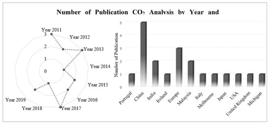 The systematic literature review has provided a much-needed basis for collecting and analyzing CO2 data. Several keywords and related concepts were used as search strings in the journal databases—for instance, “CO2 emission from transportation”, “CO2 emission from transportation using GIS application”, “low carbon cities”, “sustainable development”, “policy of low carbon cities” and “measurement of CO2 from transportation”. However, the search carried out in this study is limited to the period from January 2008 to September 2019 because the first pilot initiative was launched in 2008 [59]. In order to explore the analysis done by previous studies and to gather the relevant resources, a broad search protocol was used through multi-disciplinary academic publishing and distribution bibliographic databases, such as Google Scholar, ScienceDirect, Elsevier and Springer. Twenty journals were selected for an in-depth review due to the similarity in the previously carried-out investigations, although some of the investigations have been expanded using several elements depending on the scope of the studies [37,41]. Figure 5 shows the number of publications that analyzed CO2 emissions, with the highest numbers of publications in 2011, 2013 and 2017. Most of the studies were carried out in China.