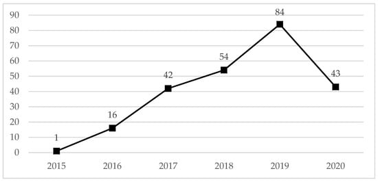 As regards the evolution of research, growth has been constant and progressive (Figure 1), from the first publications in 2015 (n = 1) and 2016 (n = 16), to the greatest development in 2018 and 2019, with the latter recording the most publications (n = 84). However, we found a slight decline in 2020 (n = 43) because only documents published in the first quarter of the year were considered (up to and including April when the search was conducted).