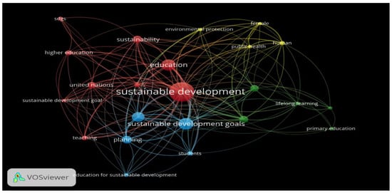 The most frequently used keywords were “Sustainable development” (57 times), “Sustainable Development Goals” (31 times), “Education” (29 times), and “Quality education” (25 times), thus coinciding with the thematic area of our study. The rest of the words obtained frequencies lower than 20, being always equal or higher than six which was the inclusion criterion to be met. All the keywords that fulfilled the stipulated criteria are related to educational, environmental, and health issues, coinciding with the main focus of the study. The VOSviewer software was used to extract the relational nodes, reflecting the relationship generated between the keywords (Figure 2). In this sense, the size of the words and of the node indicates the frequency of appearance and the number of connections with other descriptors. The different colors reflect the grouping of these words into different sets.