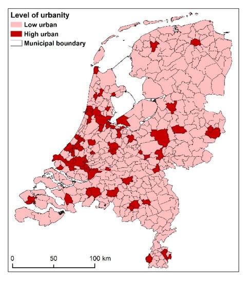 An additional variable that is used in this study is the level of urbanity of the municipality to which the neighbourhood belongs. As mentioned before, we wanted to investigate whether the relationship between socioeconomic status and greenness differs between cities and small towns/the countryside. The data for urbanity are likewise taken from Statistics Netherlands (CBS). Urbanity is based on address density and is presented by CBS in five classes, from very strongly urban to not urban. In our analyses we combined very strongly urban and strongly urban, as well as moderately, weakly urban and not urban. A density above 1500 addresses per km2 is defined as highly urban and densities below this value as signifying a low level of urbanity. Of all neighbourhoods, 32% are located in a high-urban municipality and 68% in a low-urban municipality (see Figure 1).