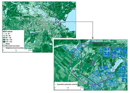 The Normalized Difference Vegetation Index (NDVI) indicates the presence of green biomass, based on the ratio of near infrared and red light [34]. The NDVI approach differs from the land-use approach in that small green elements, such as street trees and domestic gardens, also contribute. Furthermore, different types of greenery result in different NDVI scores. For example, woodlands (when in leaf) tend to score higher than grassy areas. NDVI assessments are based on satellite imagery, in this case on LANDSAT5 data for 25 May and 25 July 2012, both cloud-free days. The average of the NDVI scores for these two days was used. In principle, the NDVI score is unitless and ranges from minus one (−1) to plus one (+1). We re-scaled the scores. For convenience, the original scores above 0 were multiplied by 250. All original scores below or equal to 0 (indicating an absence of green biomass, which may include surface waters) were given a new score of 1, to prevent blue space (water) and greenspace from cancelling each other out. Subsequently, scores were aggregated to the neighbourhood level in two steps. In the first step, mean NDVI values were calculated for the same two distances (buffers) around each 6-digit postcode as before. In the second step, the average of these means was calculated over all 6-digit postcodes within a neighbourhood (see Figure 2).