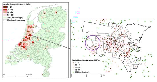 The first quality aspect deals with the peace and quiet that may be experienced during visits to nearby greenspaces. Given that stress reduction is an important pathway linking greenspace and health [35], this is likely to be a relevant quality aspect with regard to well-being effects. The metric is based on the amount of greenspace that is locally available, in relation to the number of people that may be expected to visit this greenspace for recreational purposes. The lower the availability per person, the less peace and quiet is likely to be experienced during a visit. Thus, in contrast to the previous metrics, this metric not only looks at the amount of greenspace, but takes the size of the local demand for greenspace into account, specifically the demand for walking in a natural environment. Green land uses are assigned a capacity in terms of the number of people they can accommodate per hectare per day. This capacity is high for urban parks and forests and low for agricultural areas, especially if the path density in the latter is low and its visual openness is high (one can oversee a large area at one glance). Subsequently, the available capacity is distributed over the neighbourhoods, having their midpoint within a distance of 2.5 km of the green area, proportionally to the size of the demand originating from the different neighbourhoods within this distance. The outcome is the capacity assigned to a neighbourhood, expressed as a percentage of the capacity that is needed to fully satisfy the demand originating from that neighbourhood. Within the model, a neighbourhood is not allowed to receive more capacity than it needs; therefore, the maximum value of this metric is 100%. Values below 100% are indicative of shortages. The model, called AVANAR, has been described in more detail elsewhere [36]. Its outcomes have been shown to be related to recreational behaviour [37,38]. In this study, supply data are mainly from 2008 and demand data from 2012 (see Figure 3).