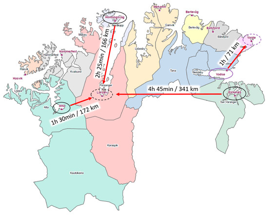 Figure 1 shows these airports along with the airports’ catchment areas, and the driving time and distance between these airports and the nearest alternative airports Lakselv (LKL) and Vardø (VAW).