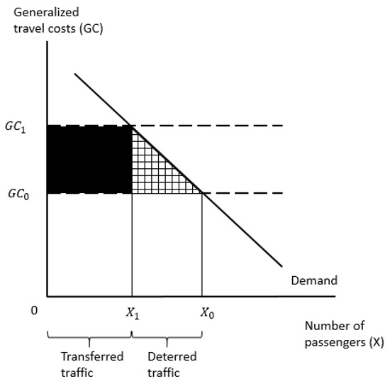 Figure 2 illustrates the change in consumer surplus (CS) from a general increase in travel costs. The difference in generalized travel costs (time costs + payable travel costs, like fares and shuttle services) together with the deterred traffic (X0–X1 in the figure) and the traffic that will use the adjacent airport (X1), here taken as the best alternative transport is used to calculate the black and crosshatched area. The black area is the loss in consumer surplus for the passengers who will still travel from the adjacent airport even if it is more expensive, while the crosshatched area is the loss for those who will abstain from travelling because of the higher travel costs. The figure shows a composite average. In reality, the black + crosshatched trapezoid are calculated for different market segments, depending on e.g., the passengers’ travel purpose and place of visit or residence.