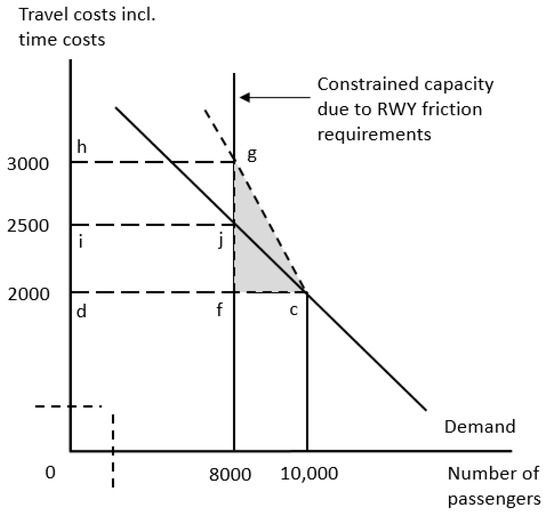 Figure 4 illustrates the costs for the affected 10,000 passengers in our example if the services continue, but with reduced seat capacity for given affected flights. If there is a segment of the market where the change in friction coefficient requirements causes unexpected disruptions in terms of reduced regularity in a more classical sense (situation (b) or (c) in the list above), a higher economic cost h–d per affected trip is the likely result. The economic costs for this group of passengers will correspond to the area hgcd. The reason that the costs are higher for situation (b) and (c) is mainly due to the higher time costs when unexpected delays and/or disruptions occur. Of this subset, 2000 passengers will abstain from travelling in this example whereas the remaining passengers will use alternative transport.