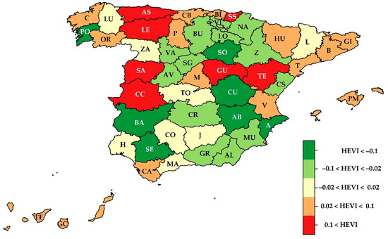 Following the Organisation for Economic Co-operation and Development-JRC methodological procedure [89], an uncertainty and sensitivity analysis was conducted in order to evaluate if the ranks and scores of the index remain robust using different weights and levels of aspiration. For this, we used Monte Carlo simulation combining different choices of weights and aspiration levels and then selected a statistically representative sample comprising 16,566 combinations, with a 99% confidence level and 1% sample error. The HEVI was, therefore, estimated for each combination, resulting in 16,566 values for each of the Spanish provinces, generating an empirical probability distribution for the composite index. The results of the uncertainty analysis revealed a high degree of consistency with the principal results obtained for the model, both in terms of the HEVI values and ranking. Furthermore, the sensitivity analysis indicated that the weighting scheme has a greater impact on the results than the aspirations levels. After assessing the methodological robustness of the HEVI, its results for the 50 Spanish provinces are shown in Table 3 and Figure 2 below: