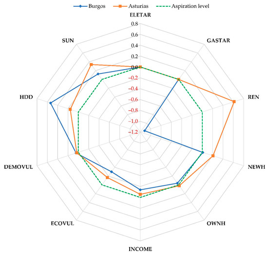 In fact, the analysis reveals that territories with similar values in the incidence of energy-vulnerable population obtain very different values in household energy vulnerability. This is due to different performance in the other partial indicators. An example of this is the case of Burgos and Asturias, whose performance in the various dimensions based on deviation variables is shown in Figure 3. This figure represents the deviation variables for each partial indicator in terms of their aspiration level. Positive deviation variables (values above the broken line) are weaknesses for the province in question, because they result in a higher value on the index. In contrast, negative deviation variables (values below the broken line) are strengths for these provinces, because they lower the score in the household energy vulnerability index.