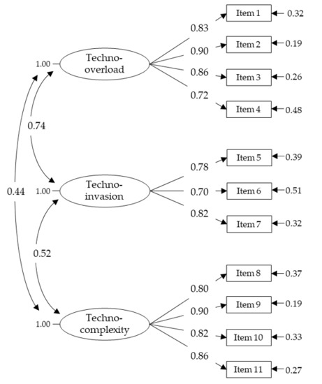 Table 1 shows CFA results for different factor models tested to better understand the measurement structure of the scale. Comparison between models and the chi-squared difference test showed that the three-factor model, depicted in Figure 1, was the best fitting one, confirming the structure of the scale (H1a). Factor loadings ranged from 0.83 to 0.90 for techno-overload, from 0.70 to 0.82 for techno-invasion, and from 0.80 to 0.90 for techno-complexity. Table 2 shows reliability and validity coefficients. Alpha and CR coefficients were greater than 0.70, while AVE values were higher than 0.50. In addition, all CR values were higher than AVE values; thus, reliability and convergent validity were achieved (H1b and H1c). Moreover, in all cases the square root of AVE value was higher than interrelated correlations, and AVE was greater than MSV and ASV coefficients; therefore, discriminant validity was also confirmed (H1d).
