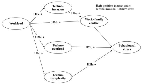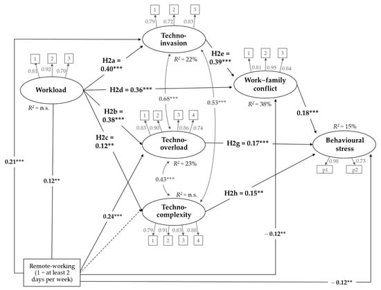 The hypothesized model, depicted in Figure 3, fitted to the data well: χ² (154) = 502.58, p < 0.001, CFI = 0.96, TLI = 0.95, RMSEA = 0.06 (90% CI: 0.05, 0.06), SRMR = 0.04. According to the model, workload was positively related to techno-invasion (H2a), techno-overload (H2b), techno-complexity (though to a weaker extent; H2c) and work–family conflict (H2d). Techno-invasion was positively related to work–family conflict (H2e), which in turn was positively associated to behavioural stress. Moreover, both techno-overload (H2g) and techno-complexity (H2h) showed a direct positive relationship with behavioural stress. Finally, the control variable remote working showed a positive relationship with workload, techno-invasion and techno-overload, while its relationship with work–family conflict and behavioural stress was negative. The model explained about 22% of the variation in techno-invasion, 23% in techno-overload, 38% in work–family conflict and 15% in behavioural stress; the variance explained for workload and techno-complexity was not significant. Table 5 shows all the statistically significant indirect effects evaluated through the use of bootstrapping procedure. Results reported in the first line confirmed the indirect effect from techno-invasion to behavioural stress, mediated by work–family conflict (H2f).