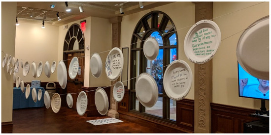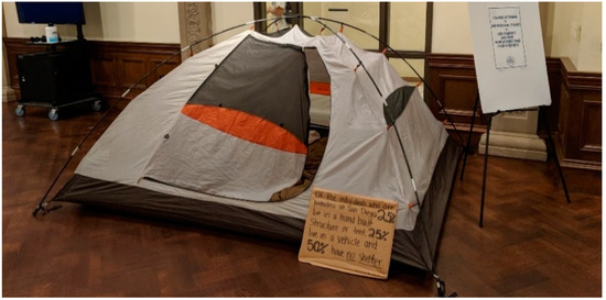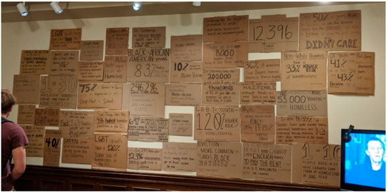 To prepare our students to engage with the social factors influencing their project designs, they were assigned to participate in Homelessness and Food Insecurity Awareness Week, which consisted of a series of on-campus events. Students completed a four-part assignment exploring homelessness. First, each student was required to visit the mobile shower unit on campus that Think Dignity had on display. Students were informed that their final project would interface with this unit and were encouraged to take pictures and ask questions. Second, students were assigned to visit interactive exhibits on display, which included testimonials from individuals (and particularly members of the USD community) who have experienced homelessness. These exhibits, as shown in Figure 1, Figure 2 and Figure 3, for example, used multi-modal texts, such as statistical data, diagrams, photos, artwork, personal testimonies, and documentaries, among others, to convey information. A multimodal approach seeks to not only explore written and spoken language, but also engage students through a range of modes while increasing students’ interests through different resources [23]. It was surprising for many to discover that there were 150 current students experiencing homelessness (~2% of our generally wealthy student population) [24]. Third, students could choose to attend one event of their choice from a provided list, which included a Housing and Food Access Resource Fair, a documentary and discussion, a candlelight vigil where stories about people experiencing homelessness were shared, or attending a political festival centered around homelessness.