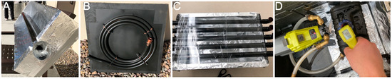 Representative water heater prototypes. Panels (A–C) depict designs of solar water heaters, while panel (D) shows a design that heats water using heat output from a car’s exhaust system.