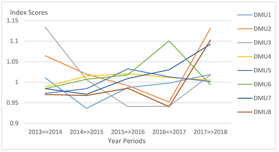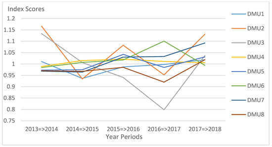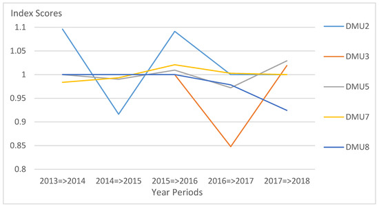 As seen in Table 5 below, there are three DMUs (DMU1, DMU4, and DMU6) that show no significant progress in terms of technical efficiency performance over the period of 2013–2018 in every time interval. This result implies that the DMUs are operating in a “no-change” manner throughout these years. They show no progress nor regress within the year periods. These DMUs were not included in the graph anymore. It is also noticeable that DMU2 was more efficient during the 2013–2014 and 2015–2016 periods but declined on the succeeding years and maintained an efficiency score value of 1. Figure 2 displays the downward and upward trend of DMU2 before it comes to a stable state. This can be due to the drop in the number of employees particularly on the academic personnel in 2014 and failed to regain the losses. DMU5, DMU7, and DMU8 also shown no substantial progress nor regress as data shows their individual scores are roughly around the “no-change” value. DMU3 demonstrates a huge decline in efficiency among all the others as it attains the lowest score of 0.8478 in the period of 2016–2017. Even if DMU3 performs a little progress in the following year, the average efficiency score for the whole observation periods was greatly affected by the decline from the previous year. Overall, the DMUs are not able to show improvement for the past six years. It is strongly evident by the attained 0.9969 score average.