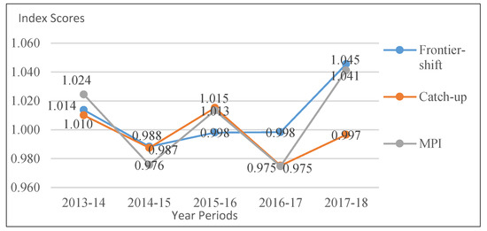 Malmquist productivity efficiency scores for the 2013–2018 period.